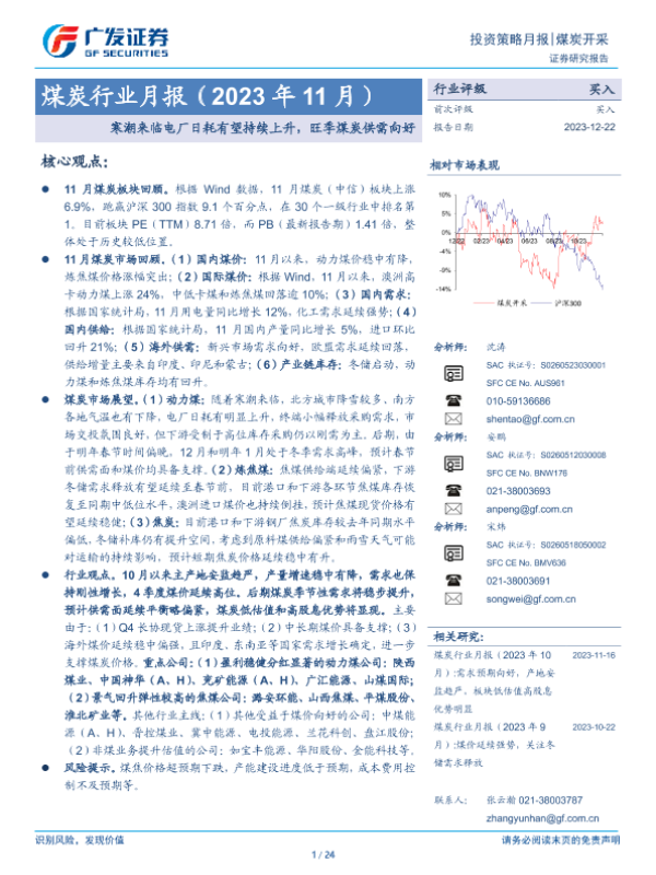 【广发证券】【20231222】20231222-广发证券-煤炭行业月报(2023年11月):寒潮来临电厂日耗有望持续上升,旺季煤炭供需向好-24页 行业研究