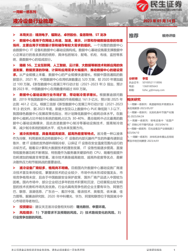 【民生证券】【20230514】机械行业一周解一惑系列:液冷设备行业梳理-15页 行业研究