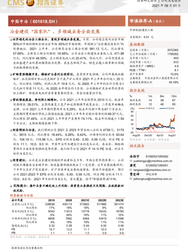 【海通证券】【20210901】中国中冶-601618.SH-冶金建设“国家队”,多领域业务全面发展-19页 公司研究