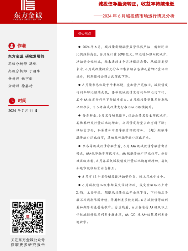 【东方金诚】【20240711】2024年6月城投债市场运行情况分析:城投债净融资转正,收益率持续走低-22页 行业研究