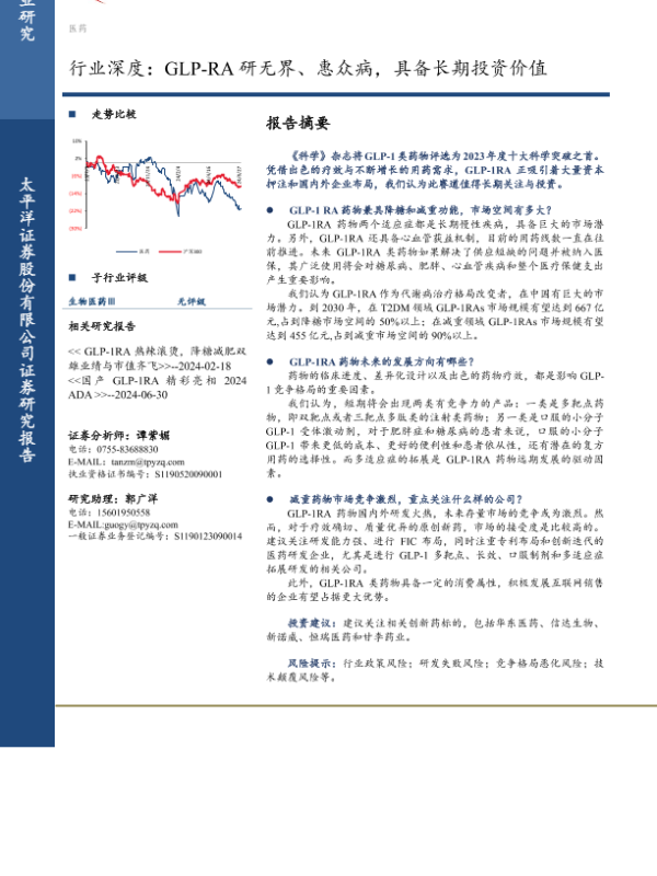 【太平洋证券】【20240724】生物医药Ⅱ行业深度-GLP-RA研无界、惠众病-具备长期投资价值-43页 行业研究