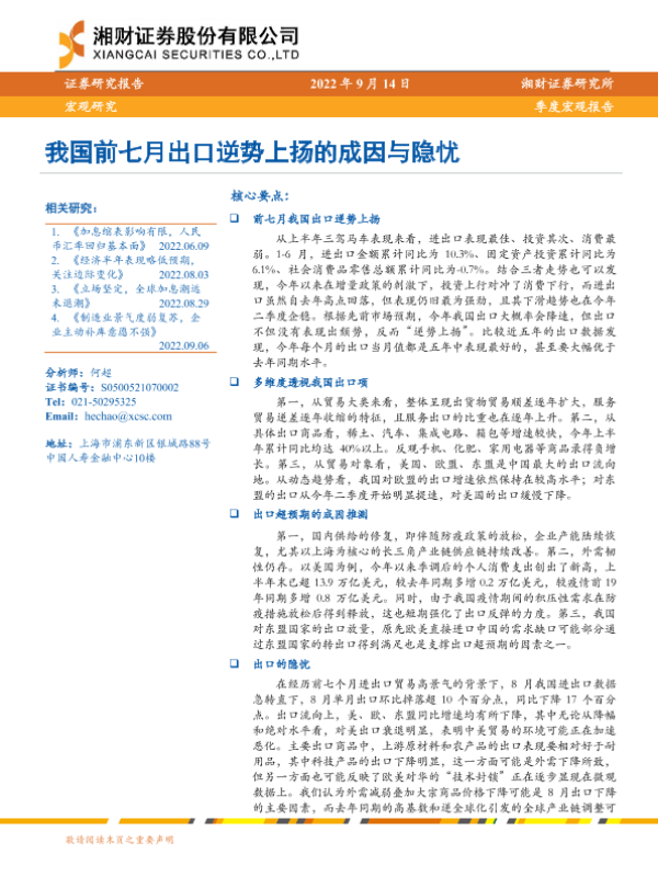【湘财证券】【20220914】我国前七月出口逆势上扬的成因与隐忧-20页 宏观策略