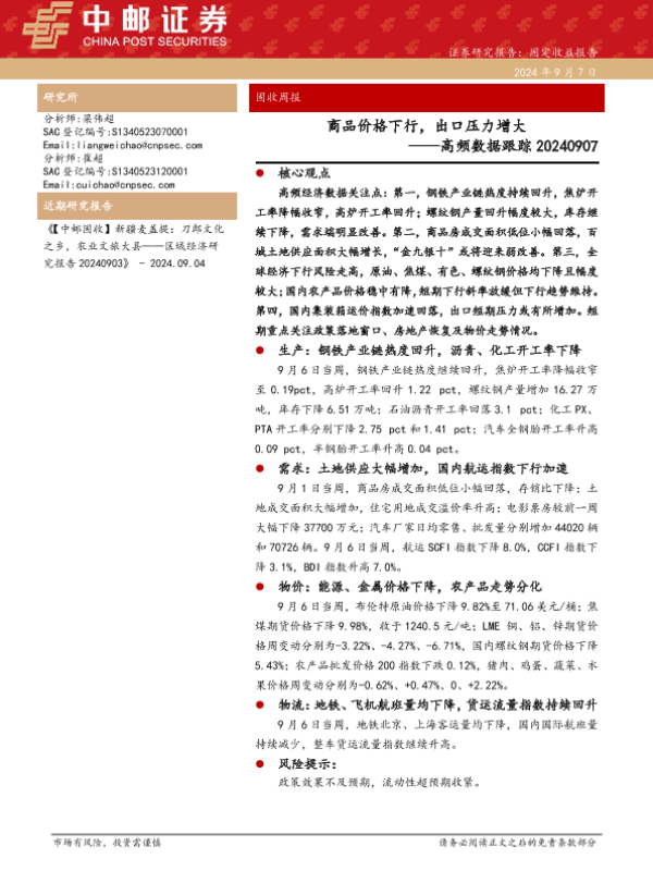 【中邮证券】【20240907】高频数据跟踪:商品价格下行,出口压力增大-13页 行业研究