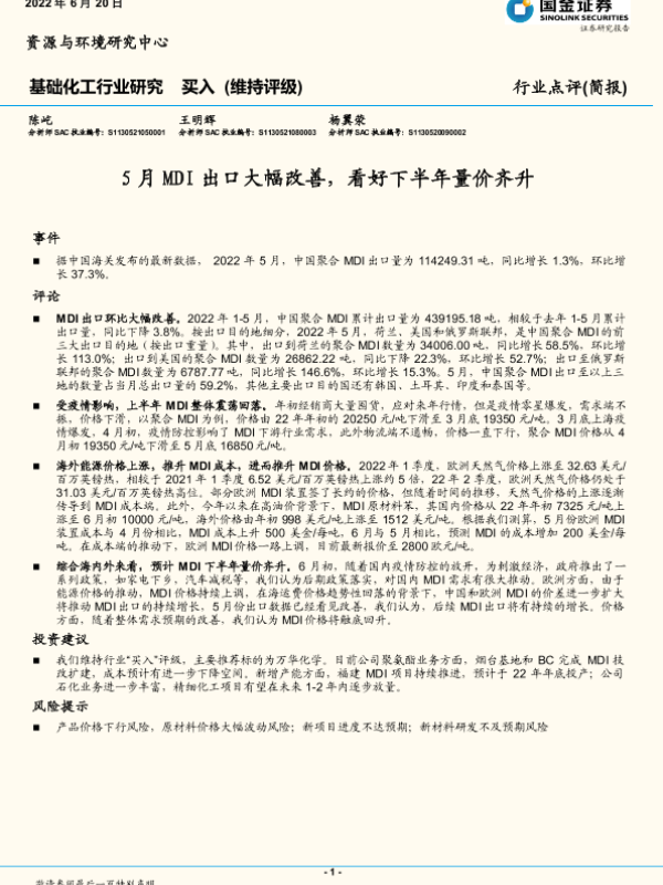 【国金证券】【20220620】基础化工行业研究:5月MDI出口大幅改善,看好下半年量价齐升-3页 行业研究