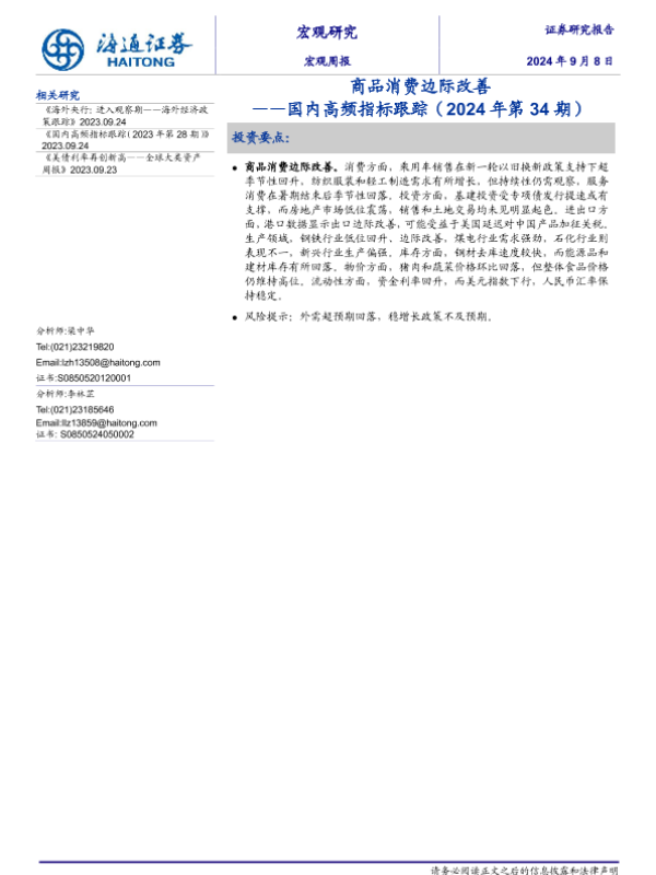 【海通证券】【20240908】国内高频指标跟踪(2024年第34期):商品消费边际改善-12页 行业研究