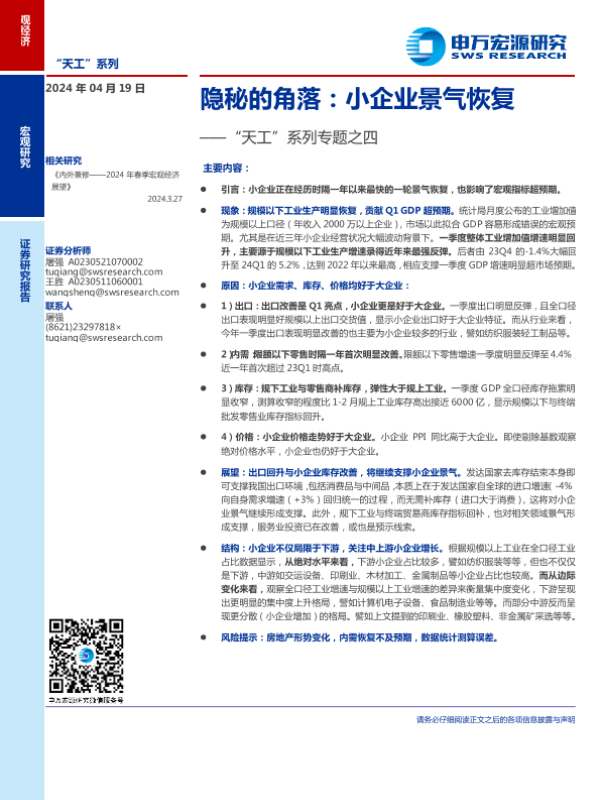 【申万宏源】【20240419】“天工”系列专题之四:隐秘的角落,小企业景气恢复-12页 行业研究