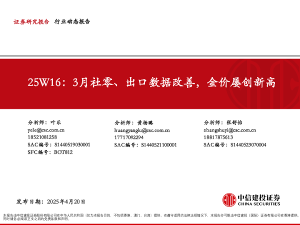 【中信建投证券】【20250420】轻工行业25W16:3月社零、出口数据改善,金价屡创新高-48页 证券期货研究报告