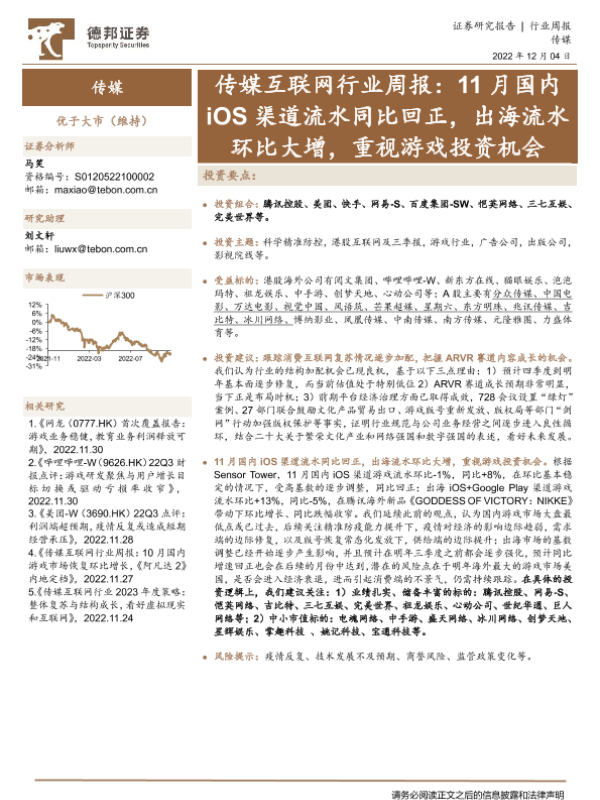 【德邦证券】【20221204】传媒互联网行业周报:11月国内iOS渠道流水同比回正,出海流水环比大增,重视游戏投资机会-16页 行业研究
