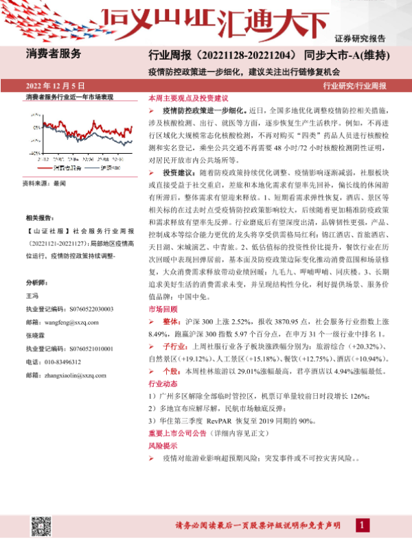 【山西证券】【20221205】消费者服务行业周报:疫情防控政策进一步细化,建议关注出行链修复机会-10页 行业研究