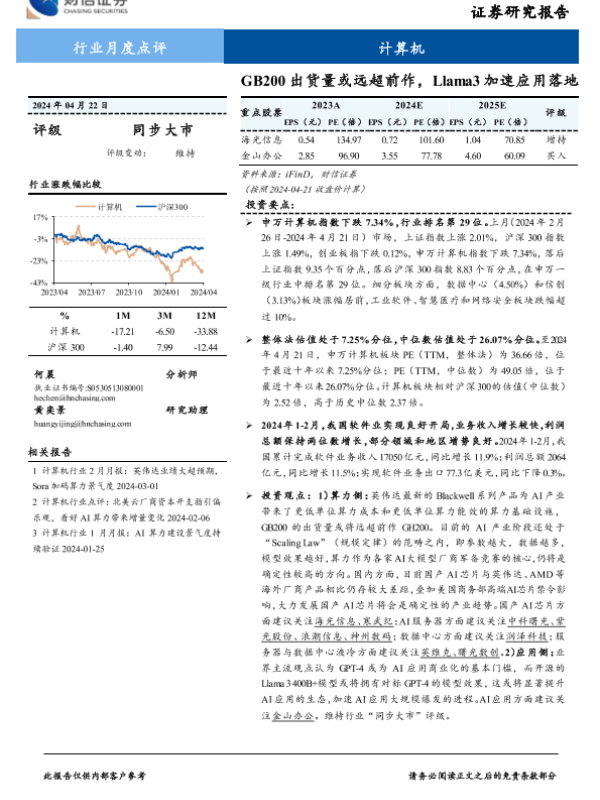 【财信证券】【20240422】计算机行业月度点评:GB200出货量或远超前作,Llama3加速应用落地-16页 行业研究