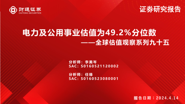 【财通证券】【20240414】全球估值观察系列九十五:电力及公用事业估值为49.2%分位数-29页 行业研究