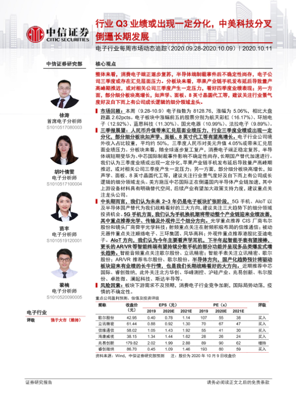 【中信证券】【20201011】电子行业每周市场动态追踪:行业Q3业绩或出现一定分化,中美科技分叉倒逼长期发展-15页 行业研究