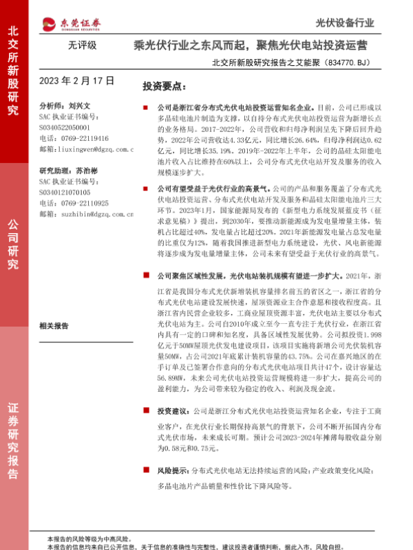 【东莞证券】【20230217】北交所新股研究报告之艾能聚(834770):乘光伏行业之东风而起,聚焦光伏电站投资运营-22页 行业研究