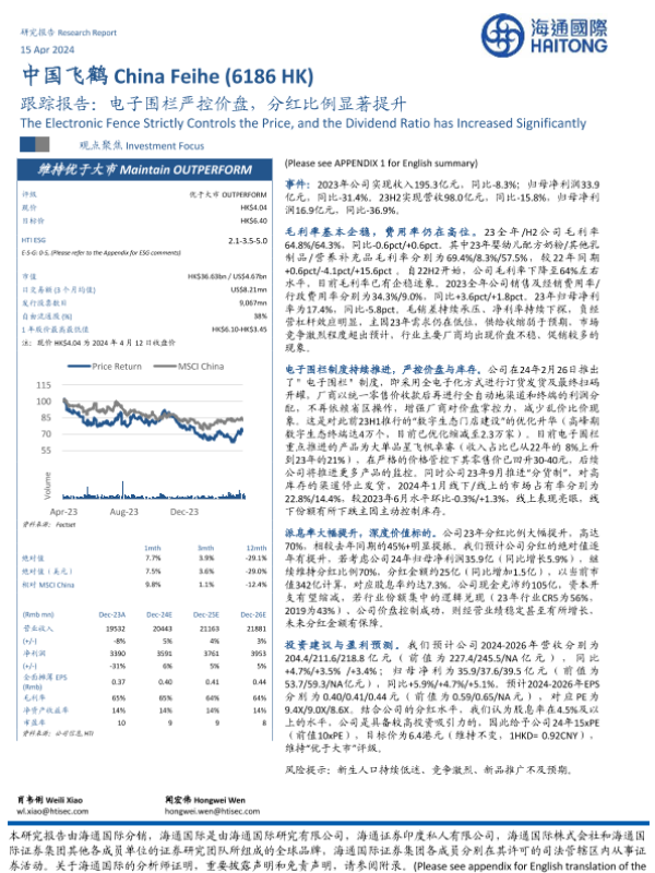 【海通国际】【20240415】中国飞鹤(06186.HK)跟踪报告:电子围栏严控价盘,分红比例显著提升-13页 行业研究