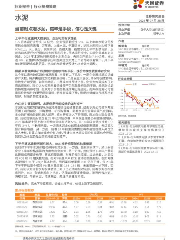 【天风证券】【20240728】水泥行业报告:当前时点看水泥,错峰是手段,信心是关键-10页 行业研究