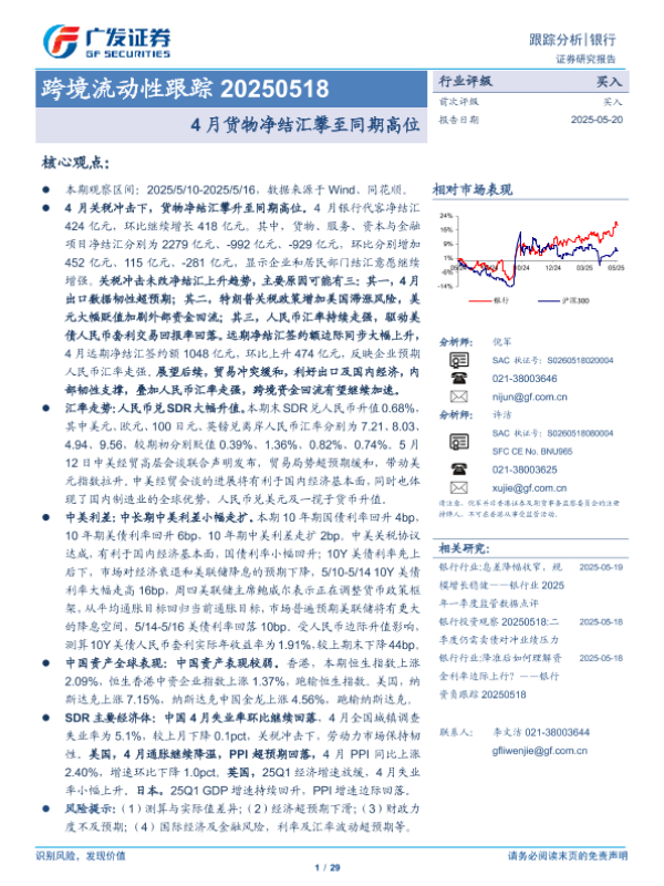 【广发证券】【20250520】银行业跨境流动性跟踪:4月货物净结汇攀至同期高位-29页 证券期货研究报告