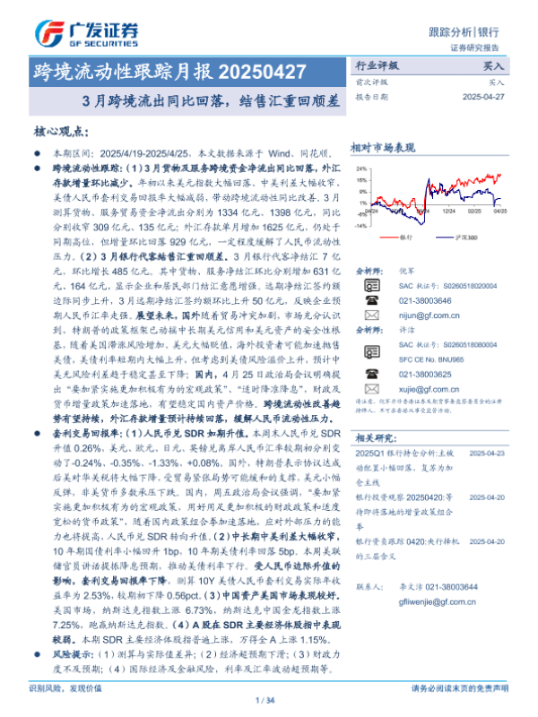 【广发证券】【20250427】银行业跨境流动性跟踪月报:3月跨境流出同比回落,结售汇重回顺差-34页 证券期货研究报告