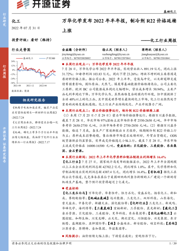 【开源证券】【20220731】万华化学发布2022年半年报,制冷剂R22价格延续上涨-39页 行业研究