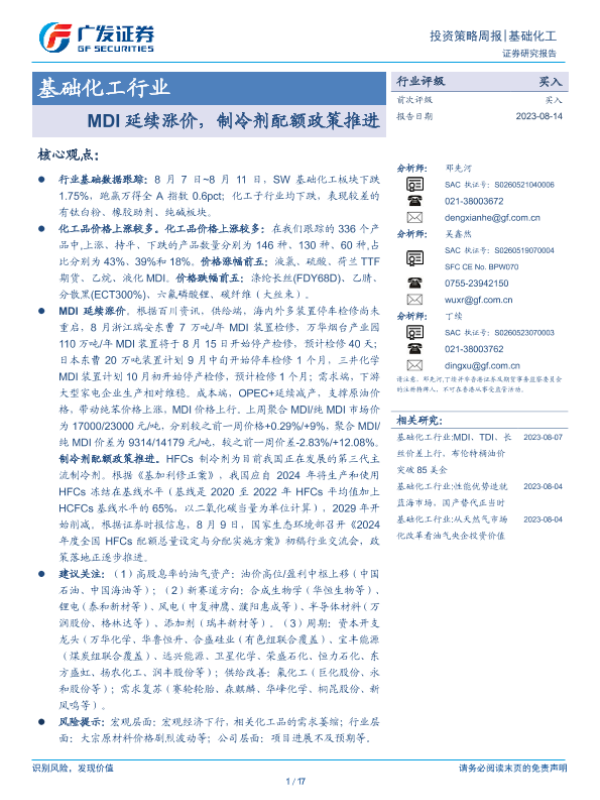 【广发证券】【20230814】20230814-广发证券-基础化工行业投资策略周报:MDI延续涨价,制冷剂配额政策推进-17页 行业研究