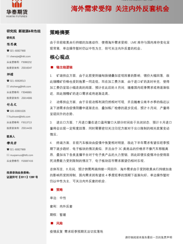 【华泰期货】【20220731】锡月报:海外需求受抑,关注内外反套机会-15页 行业研究
