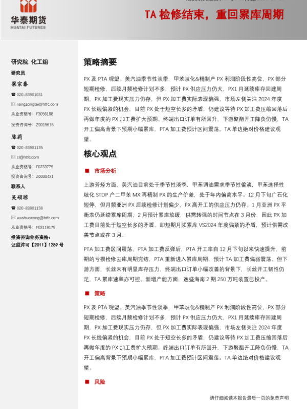 【华泰期货】【20240107】PX与PTA月报:TA检修结束,重回累库周期-16页 行业研究