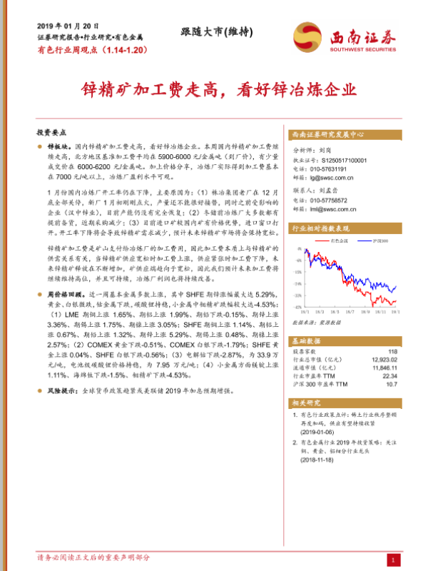 【西南证券】【20190120】有色行业周观点:锌精矿加工费走高,看好锌冶炼企业-3页 行业研究