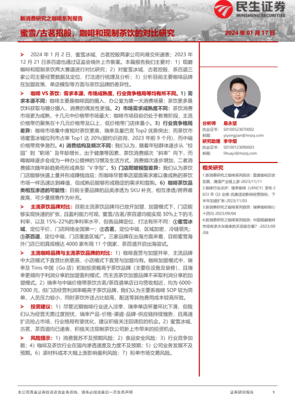 【民生证券】【20240117】新消费研究之咖啡系列报告:蜜雪古茗招股,咖啡和现制茶饮的对比研究-23页 行业研究