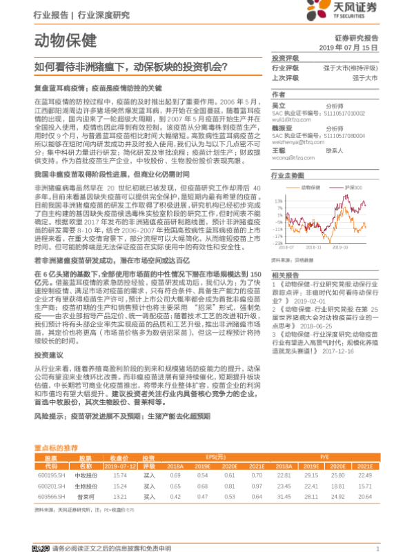 【天风证券】【20190715】动物保健行业深度研究:如何看待非洲猪瘟下,动保板块的投资机会?-19页 行业研究