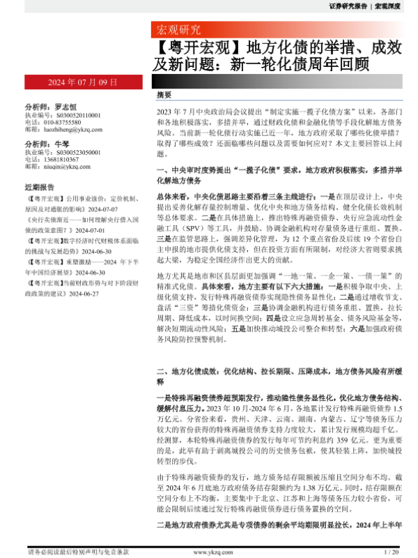 【粤开证券】【20240709】【粤开宏观】地方化债的举措、成效及新问题:新一轮化债周年回顾-20页 行业研究