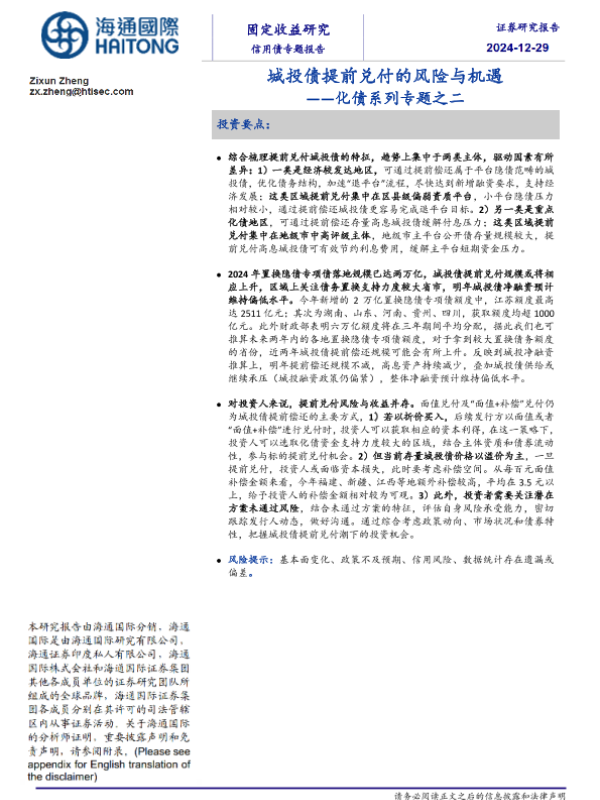 【固定收益研究】【20250103】城投债提前兑付的风险与机遇——化债系列专题之二-18页 行业研究