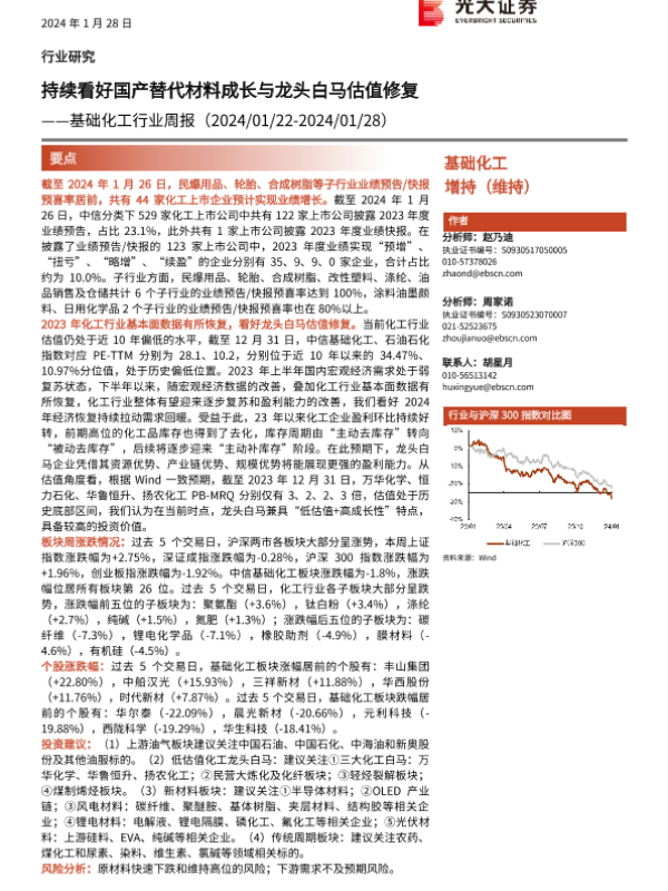 【光大证券】【20240128】基础化工行业周报:持续看好国产替代材料成长与龙头白马估值修复-34页 行业研究