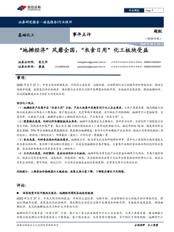 【国信证券】【20200604】基础化工:“地摊经济”风靡全国,“衣食日用”化工板块受益-5页 行业研究