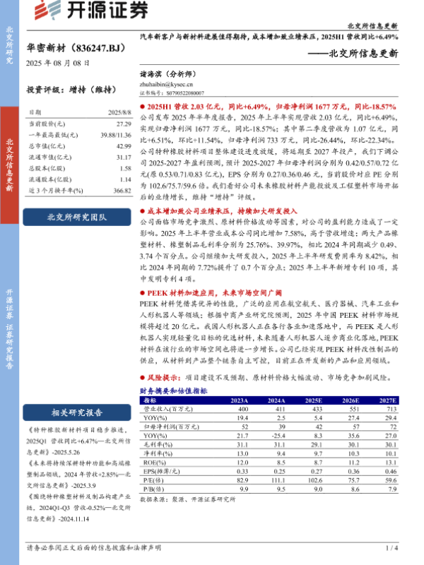 【开源证券】【20250808】汽车新客户与新材料进展值得期待,成本增加致业绩承压-4页 证券期货研究报告