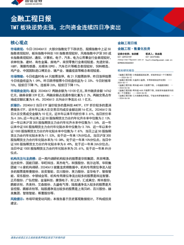 【国信证券】【20240613】金融工程:TMT板块逆势走强,北向资金连续四日净卖出-15页 行业研究