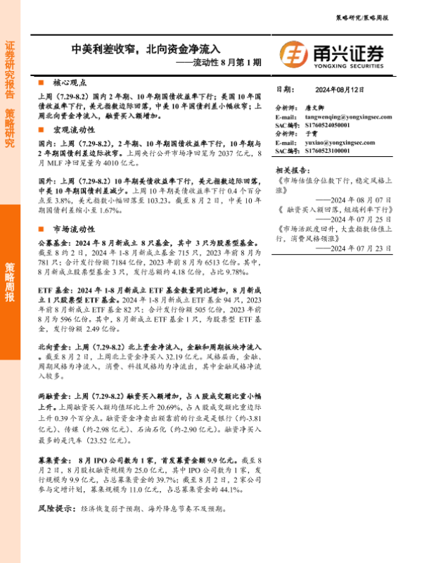 【甬兴证券】【20240812】流动性8月第1期:中美利差收窄,北向资金净流入-11页 行业研究