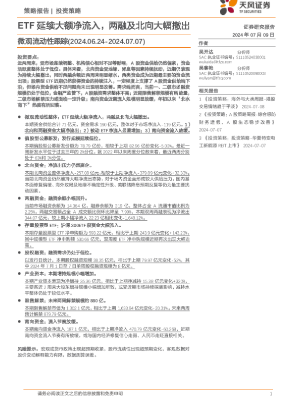 【天风证券】【20240709】微观流动性跟踪:ETF延续大额净流入,两融及北向大幅撤出-15页 行业研究