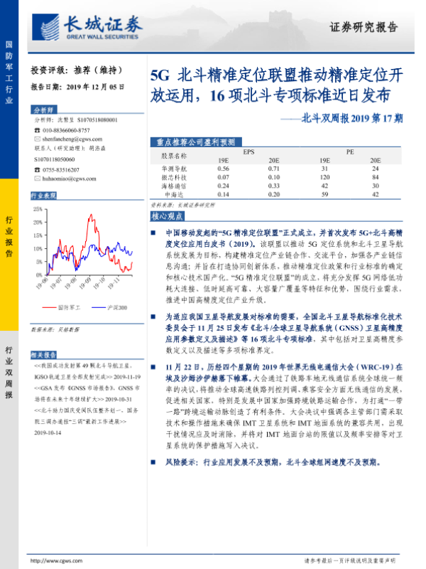 【长城证券】【20191205】20191205-长城证券-北斗双周报2019第17期:5G北斗精准定位联盟推动精准定位开放运用,16项北斗专项标准近日发布-12页 行业研究