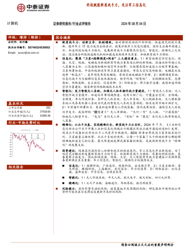 【中泰证券】【20240804】计算机行业:科技赋能新质战斗力,关注军工信息化-22页 行业研究