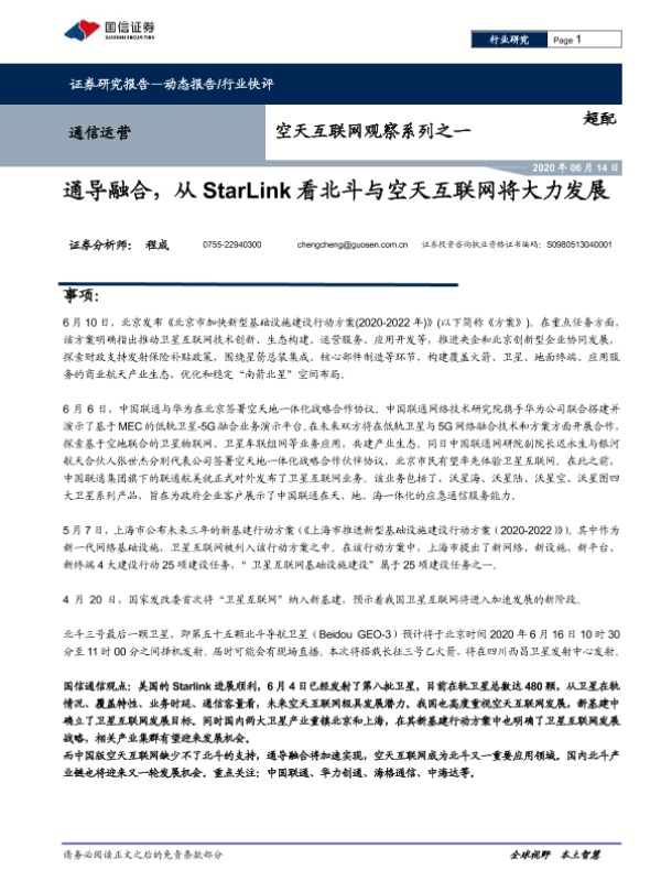 【国信证券】【20200614】空天互联网观察系列之一:通导融合,从StarLink看北斗与空天互联网将大力发展-13页 行业研究