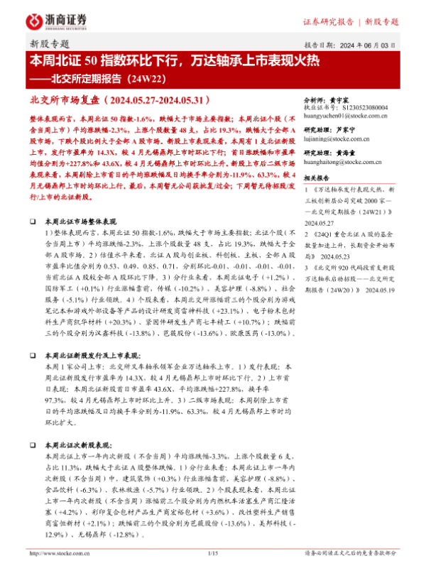 【浙商证券】【20240603】北交所定期报告(24W22):本周北证50指数环比下行,万达轴承上市表现火热-15页 行业研究