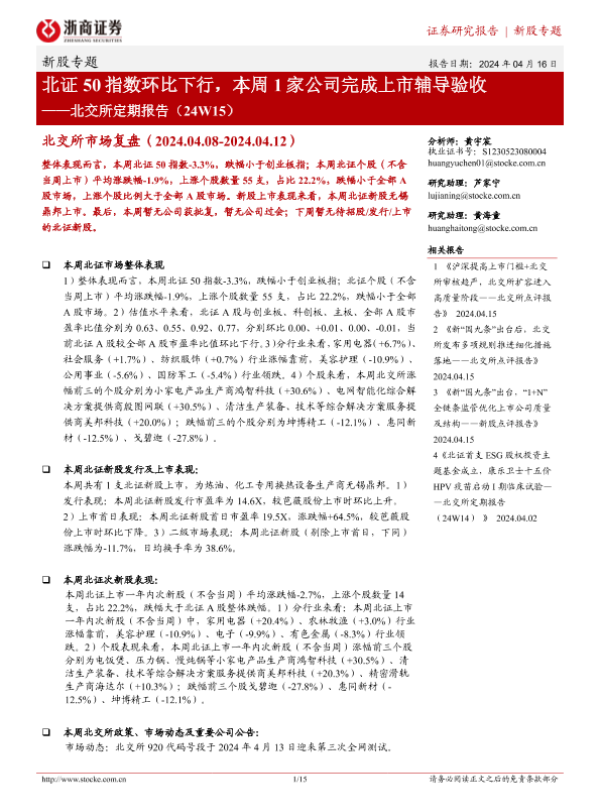 【浙商证券】【20240416】北交所定期报告:北证50指数环比下行,本周1家公司完成上市辅导验收-15页 行业研究