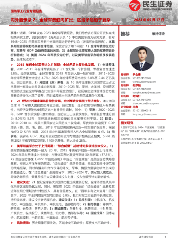 【民生证券】【20240517】国防军工行业专题报告-海外启示录2:全球军费趋向扩张;区域矛盾趋于复杂-25页 行业研究
