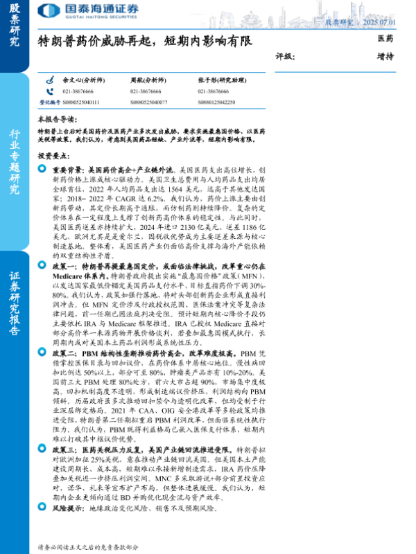 【国泰海通证券】【20250701】医药行业专题研究:特朗普药价威胁再起,短期内影响有限-11页 证券期货研究报告