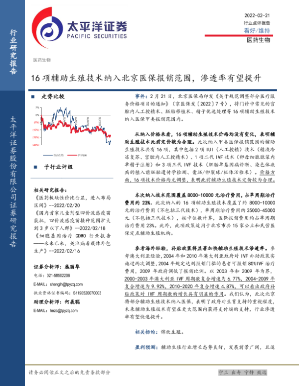【太平洋证券】【20220221】16项辅助生殖技术纳入北京医保报销范围,渗透率有望提升-4页 行业研究