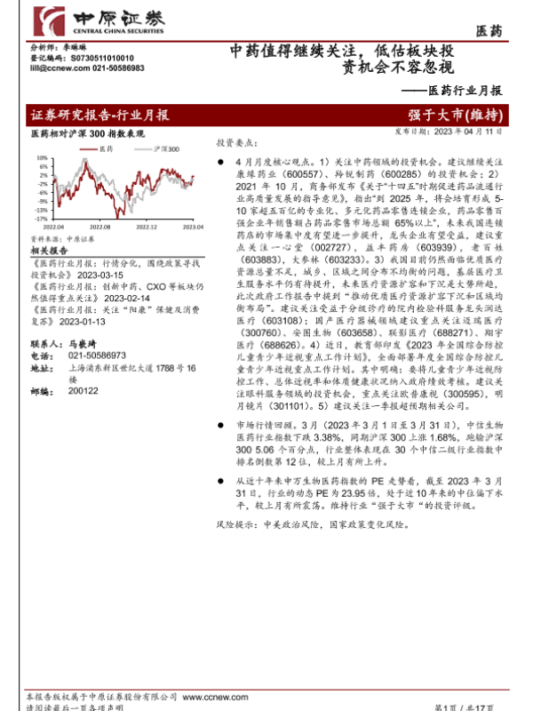 【中原证券】【20230411】医药行业月报:中药值得继续关注,低估板块投资机会不容忽视-17页 行业研究