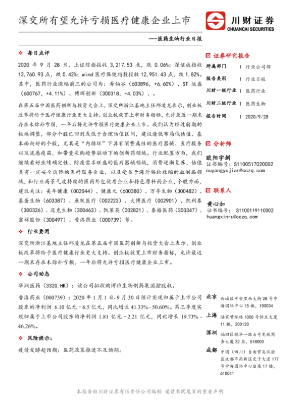 【川财证券】【20200928】医药生物行业日报:深交所有望允许亏损医疗健康企业上市-3页 证券期货研究报告