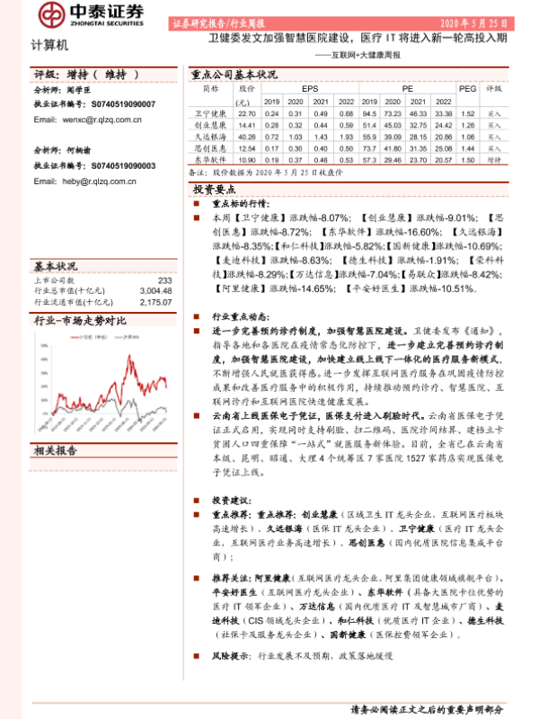 【中泰证券】【20200525】计算机:互联网+大健康周报-卫健委发文加强智慧医院建设,医疗IT将进入新一轮高投入期-9页 行业研究