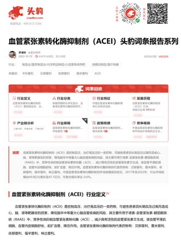 【头豹研究院】【20231012】血管紧张素转化酶抑制剂(ACEI)头豹词条报告系列-16页 行业研究