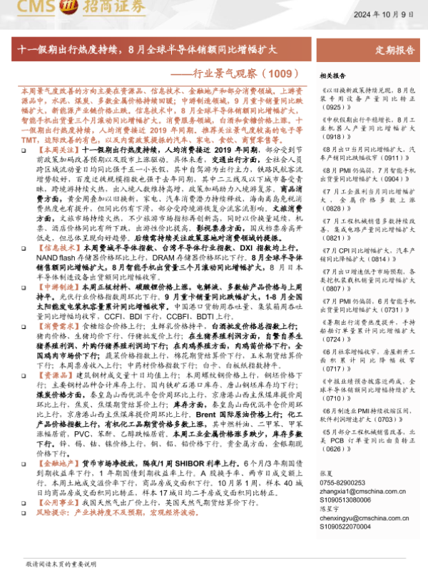 【海通证券】【20241009】2024年10月20日更新-【招商证券】行业景气观察(1009) 十一假期出行热度持续,8月全球半导体销额同比增幅扩大-35页 行业研究