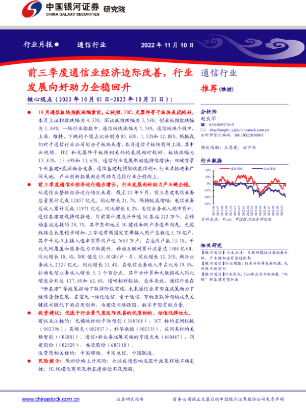 【银河证券】【20221110】通信行业月报:前三季度通信业经济边际改善,行业发展向好助力企稳回升-19页 行业研究